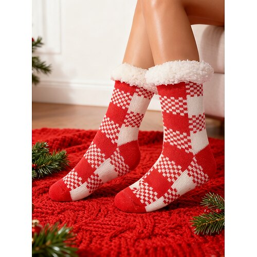 Flauschige Weihnachtssocken aus Strick für Damen, gemütliche Hausschuhe mit rot-weißem Karomuster und Plüschfutter für die Weihnachtsfeier Winter-Loungewear