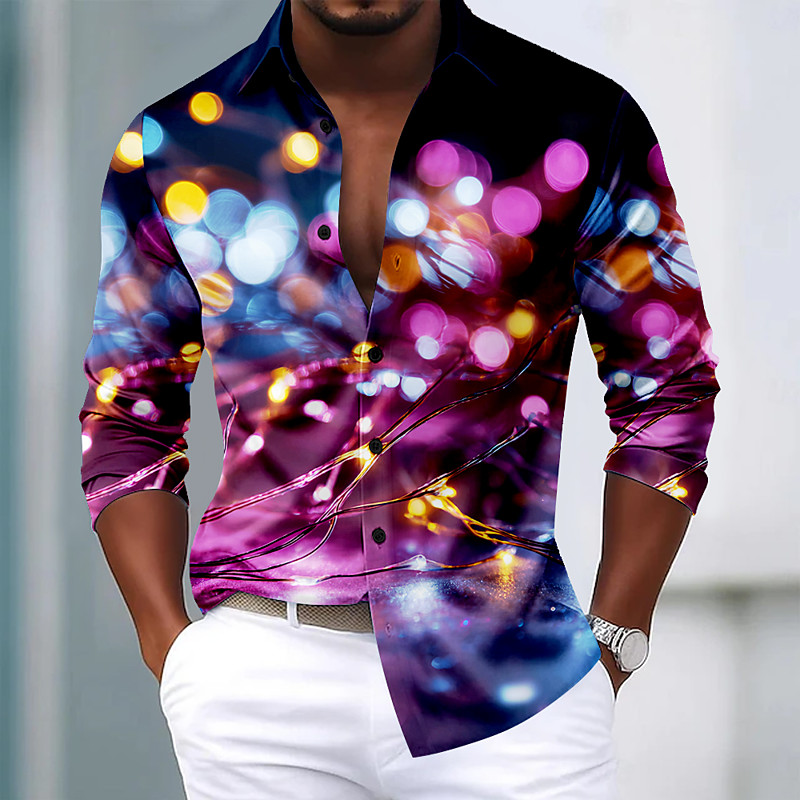 Christmas Men's Sparkling Glitter Gradient Color Christmas Light Shirt Satin Shirt Dress Shirt Long Sleeve Fashion Casual Party Holiday Summer Spring Fall Turndown 3D Print Button Up Shirts Black 1