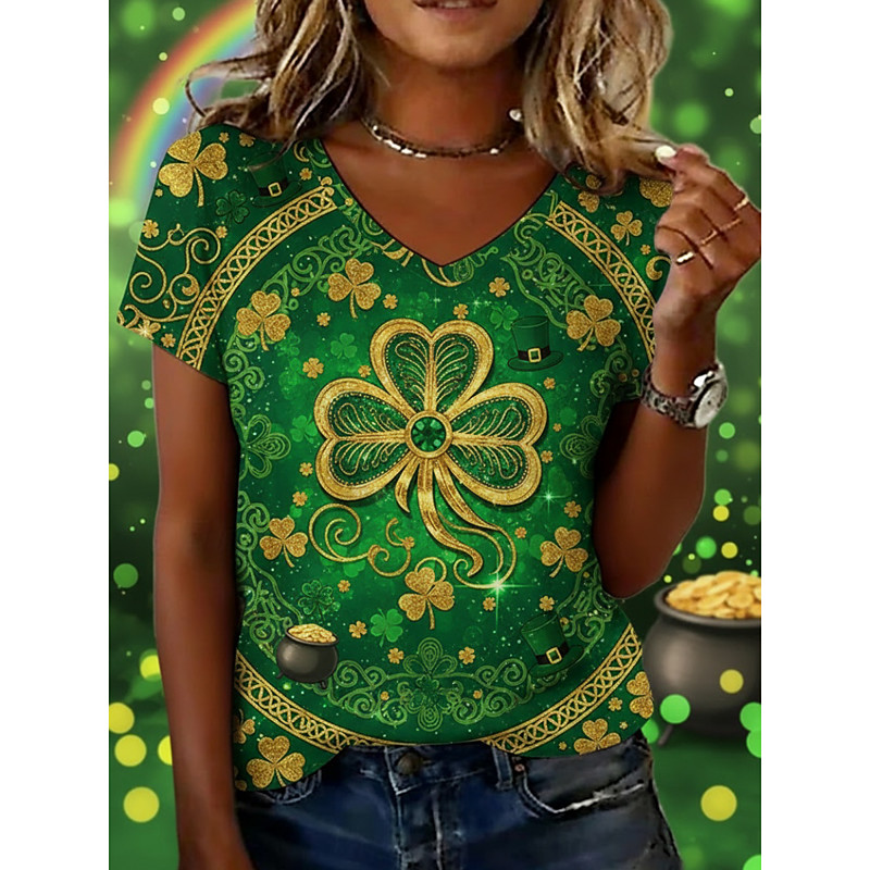 St. Patrick's Day Women's T Shirt Shamrock Stylish Classic Casual Short Sleeve V Neck Regular Tops Daily Weekend Vacation Wear Print Green Summer Spring