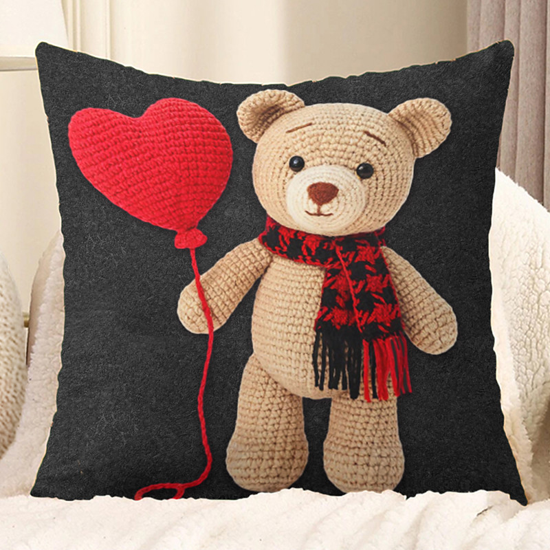 Valentine's Day 2D Flat Print Dark Pillow Cover, Bear Holding Red Heart Balloon, Adorable Valentine's Day Gift, Decorative Cushion Case for Sofa, Bed, or Chair