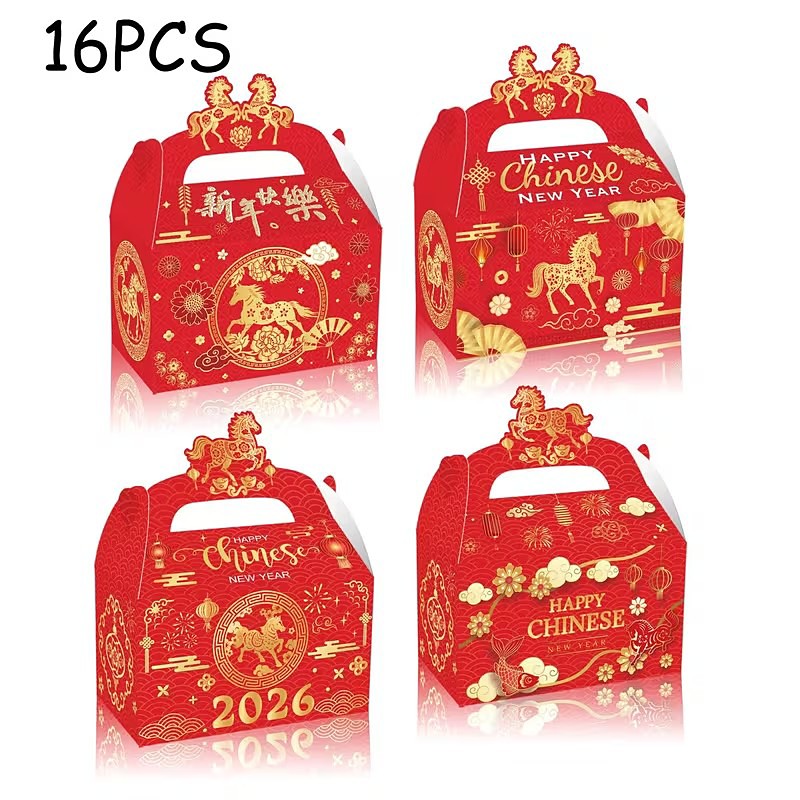 16PCS Chinese New Year Gift Boxes – 2026 Year of the Horse Candy Boxes, Lunar New Year Party Favor Boxes for Snacks and Treats, Cardboard Gift Boxes for CNY Birthday Party Supplies