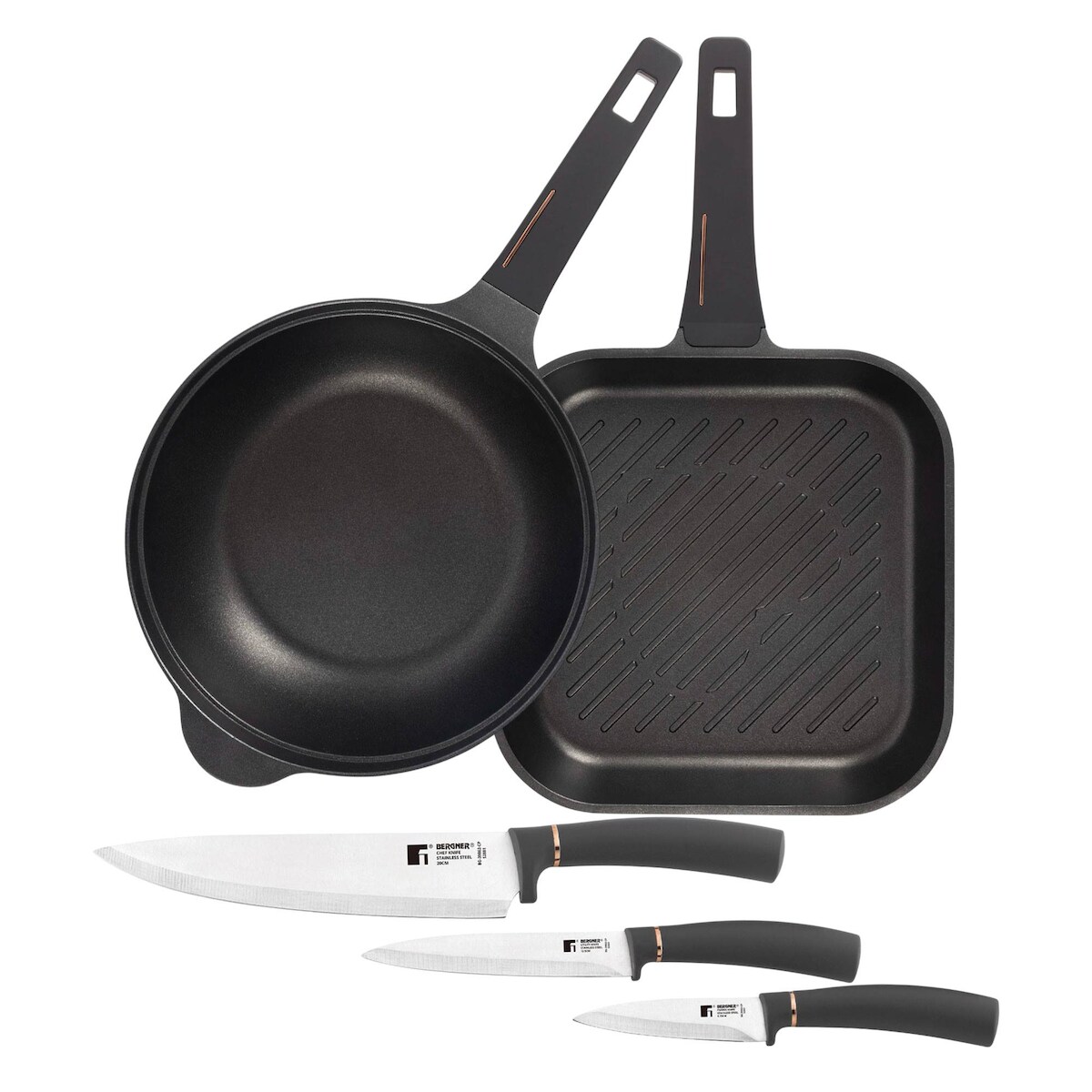 BERGNER Copper - Grillpfannen-Set aus Aluminiumguss (28x28cm) und Wok (Ø30cm) mit 3 Küchenmessern aus Edelstahl