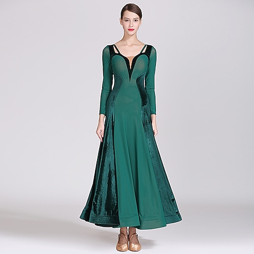 abito da ballo da sala da donna verde smeraldo, abito da valzer a maniche lunghe con giunture in velluto, scollo a V, abito da competizione moderno standard