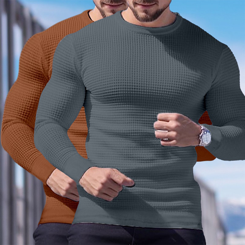 2 Piece Men's Waffle Shirt T Shirt Tee Top Long Sleeve Shirt Long Sleeve Crew Neck Crewneck Fall Spring Fall Plain Fashion Designer Basic Knitted Vacation Street Casual Top Tee for Men