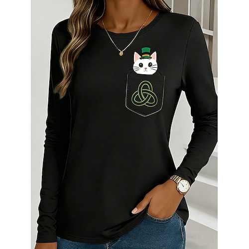 St. Patricks Day Damen T Shirt Grafik Bier Mode Stilvoll Klassisch Langarm Rundhalsausschnitt Rundhals Normale Oberteile Täglich Wochenende Druck Schwarz Weiß Grün Sommer Frühling Herbst