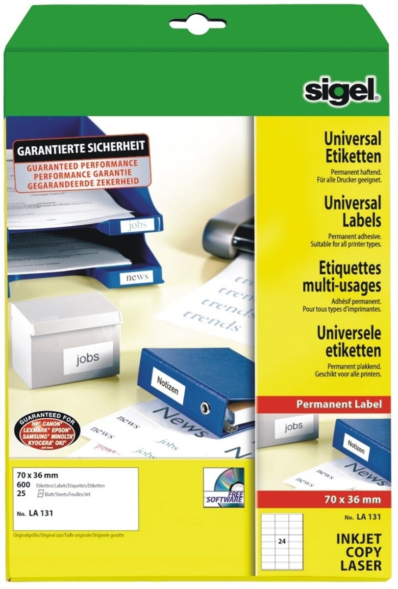 Sigel Etiketten Inkjet/Laser Kopier 70x36mm VE=10x600 Stück (25 Blatt) weiß