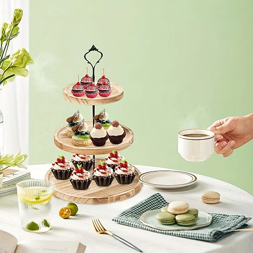 Alzata per torta multistrato in legno massello a 3 piani vassoio da dessert in ferro battuto con gamba alta Espositore per dolciumi, vassoio di frutta, espositore rotondo in legno di acacia,
