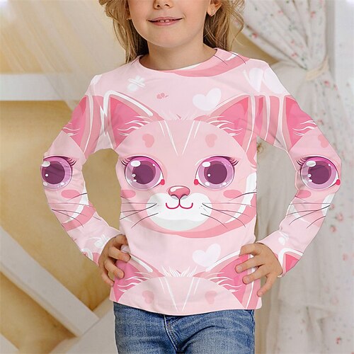 Mädchen 3D Tiermotiv Katze T-Shirt Langarm Frühling Herbst Mode Basic Kinder 4-12 Jahre Rundhalsausschnitt Outdoor Lässig Täglich Normale Passform
