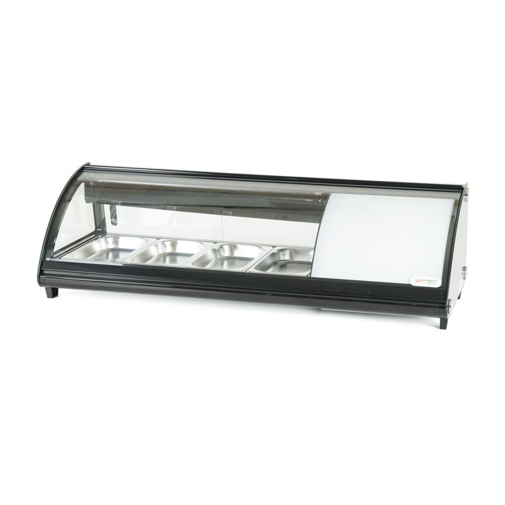 Ristoattrezzature Gekühlte Sushi-Vitrine auf Arbeitsplatte – Aufklappbares gebogenes Frontglas – Eingebauter Motor – Schwarz – 4 gn 1/3 – 113,1 x 45 x 33 h cm