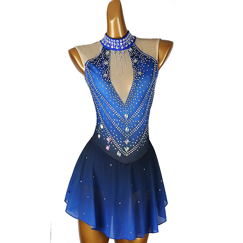 Figure Skating Dress Women's Girls' Ice Skating Dress Blue Patchwork Mesh High Elasticity Training Competition Skating Wear Classic Crystal / Rhinestone Sleeveless Ice Skating Figure Skating