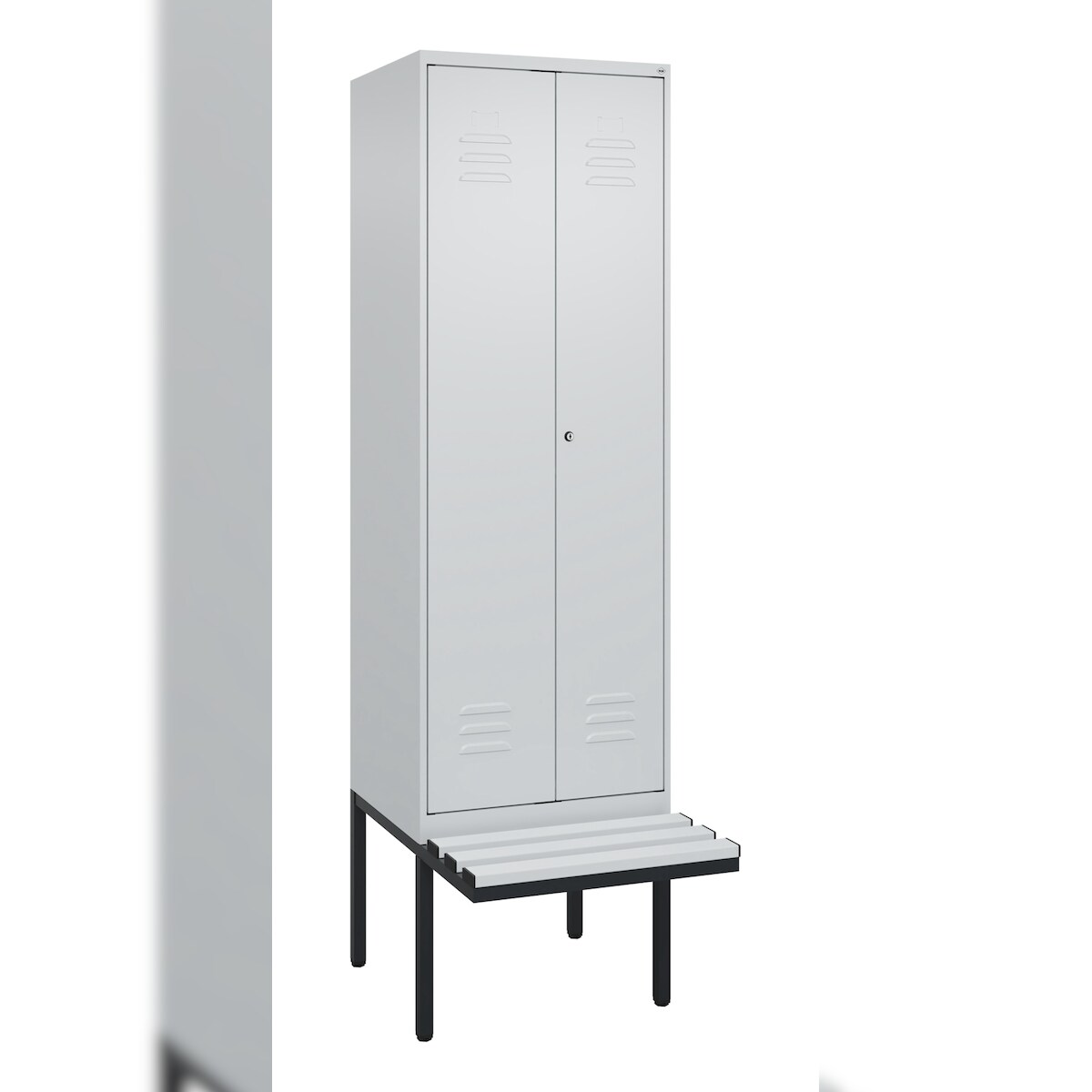 C+P Z-Spind Classic PLUS, schwebender Sitzbank aus Buche 2 Abteile, HxBxT 212x30x82cm, Zylinderschloss, Hellgrau/Enzianblau von PROREGAL
