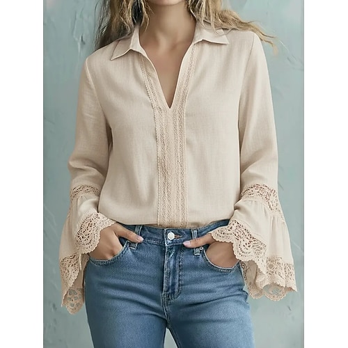 Per donna Blusa Top Eleganti Top in pizzo Arricciato Pizzo Patchwork Tinta unica Semplice Elegante Signore Essenziale Manica Lunga Scollo a V Top Regolari Quotidiano Lavoro Ferie Blu Nero Bianco Rosa