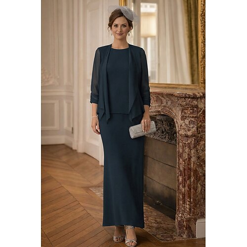 Due Pezzi Tubino Colonna Lunghezza al pavimento Abito da invitata a nozze Abito da cerimonia per signora Manica Lunga Scollo Tondo Elegante Formale Ospite di nozze Chiffon Con Stola con Tinta unita