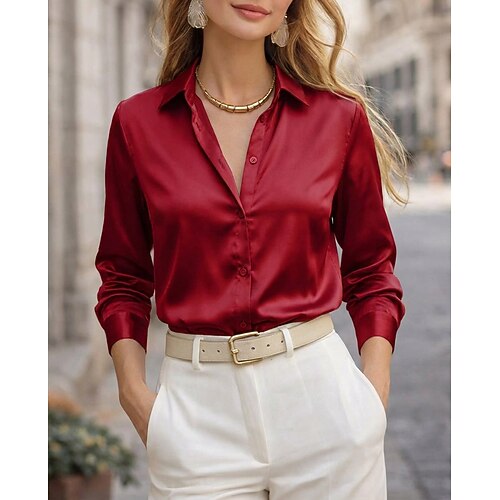 Per donna Camicia Top in raso Blusa Top Eleganti Arricciato Bottoni Drappeggiato Tinta unica Semplice Elegante Vintage Signore Manica Lunga Colletto a Camicia Top Regolari Quotidiano Ufficio Lavoro