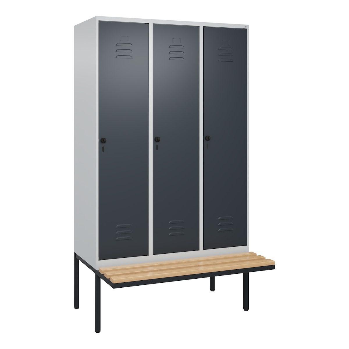 C+P Spind Classic PLUS, schwebender Sitzbank aus Buche 3 Abteile, HxBxT 212x120x82cm, Sicherheitsdrehriegel, Hellgrau/Anthrazit von PROREGAL