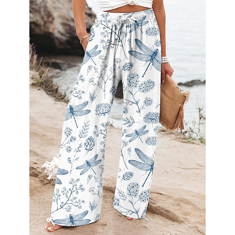 Women's Wide Leg Baggy Pants Beach Shorts Vacation Vintage Fashion Full Length High Waist Graphic Flower / Floral Drawstring Printing Soft Breathable Micro-elastic Vacation Causal Casual White Blue