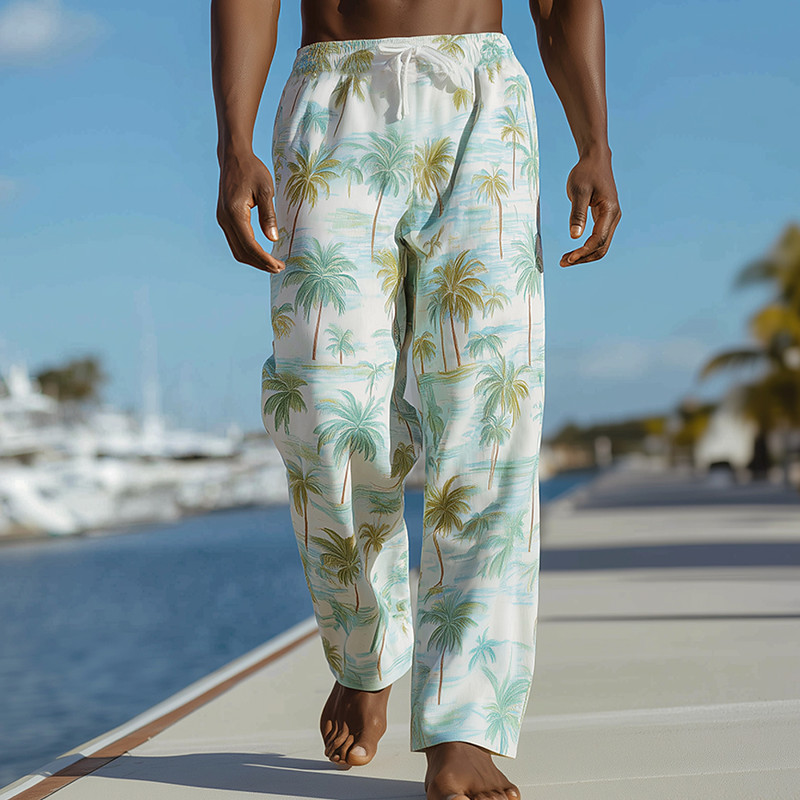 Men's Coconut Tree Tropical Plants Trousers Baggy Pants Casual Pants Mid Waist Hawaiian Outdoor Vacation Beach Wear Elastic Drawstring Waist Linen-Like Pants with Pockets Summer Spring 3D Print Blue