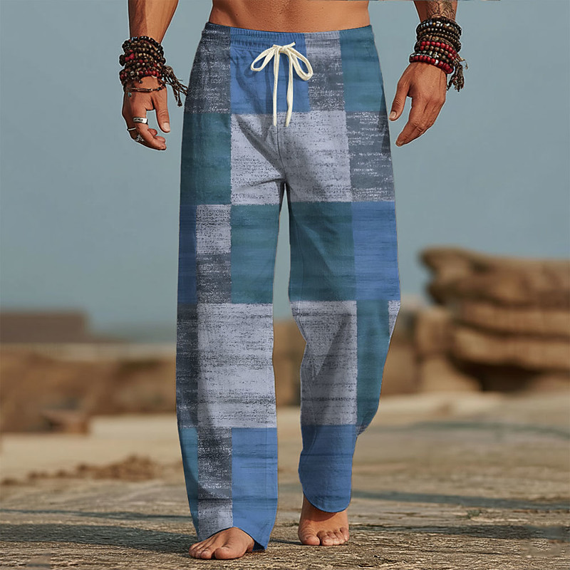 Men's Geometric Color Block Patchwork Trousers Baggy Pants Casual Pants Mid Waist Fashion Home Outdoor Vacation Elastic Drawstring Waist Linen-Like Pants with Pockets Summer Spring 3D Print Blue