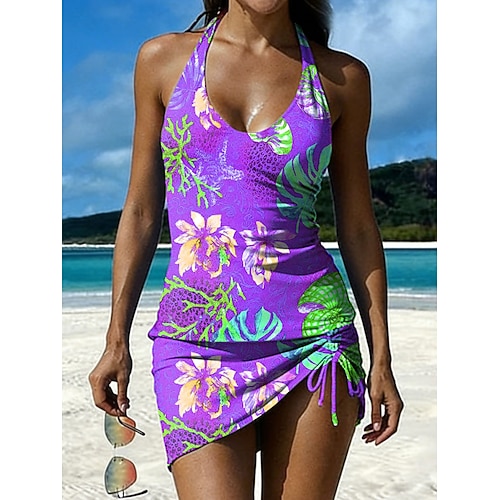 Costume da bagno tankini da donna a 2 pezzi con gonna gonna boho floreale 3D abbigliamento da spiaggia per le vacanze scollatura rotonda grafica senza maniche