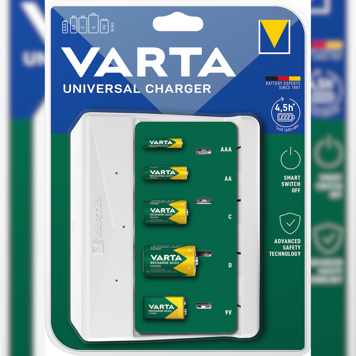 Varta Universal Charger, Nickel-Metallhydrid (NiMH), Kurzschluß, 9V, AA, AAA, C, D, 4 Stück(e), Akkus/Batterien enthalten