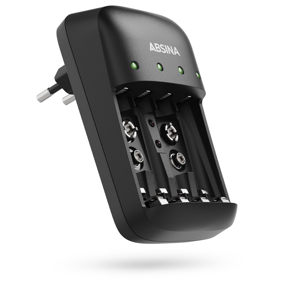 ABSINA Akku Ladegerät X4 für AA, AAA & 9V - Akkuladegerät 4-fach zum Laden von wiederaufladbaren Akkus - NiMH Ladegerät Akku Batterieladegerät