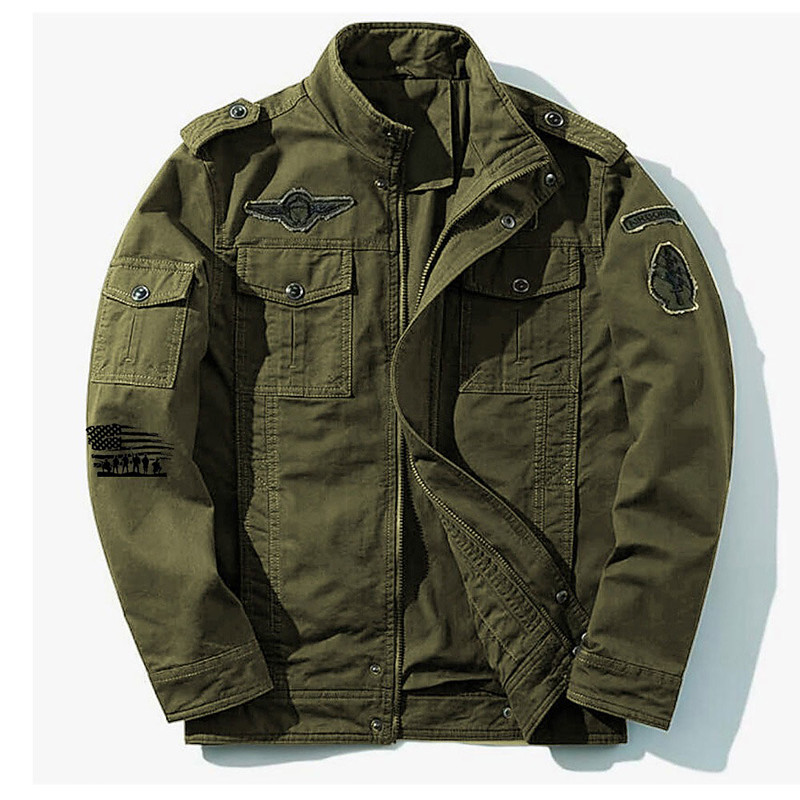 Men's Cotton Embroidered Military Jacket Cargo Jacket with Shoulder Straps Long Sleeve Standing Collar Multi-Pockets Coat Trucker Jacket Bat Print Tactical Outerwear