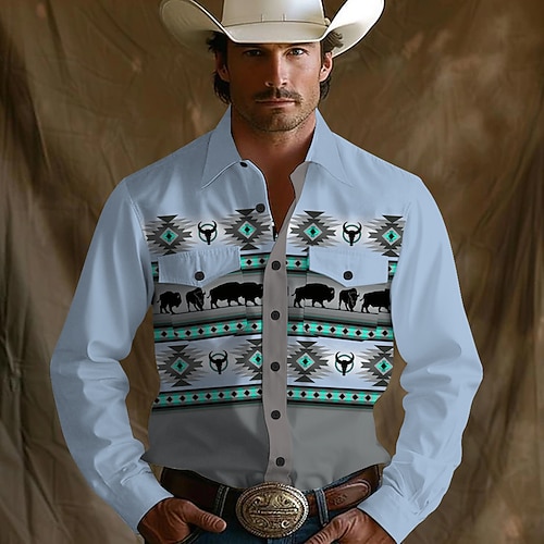 Herren Geometrisches Muster Ethik / Afrikanisch Hemd Westernhemd Cowboy-Shirt Langarm Vintage-Retro Outdoor Lässig Arbeitskleidung Frühling Herbst Umlegekragen 3D-Druck Hemden mit Knopfleiste Blau