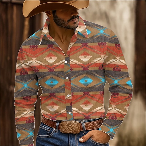 Herren aztekisch Ethik / Afrikanisch Westernhemd Knopfhemd Cowboy-Shirt Langarm Vintage-Retro Outdoor Campen und Wandern Frühling Herbst Umlegekragen 3D-Druck Zwei Fronttaschen Leinenähnliches Hemd