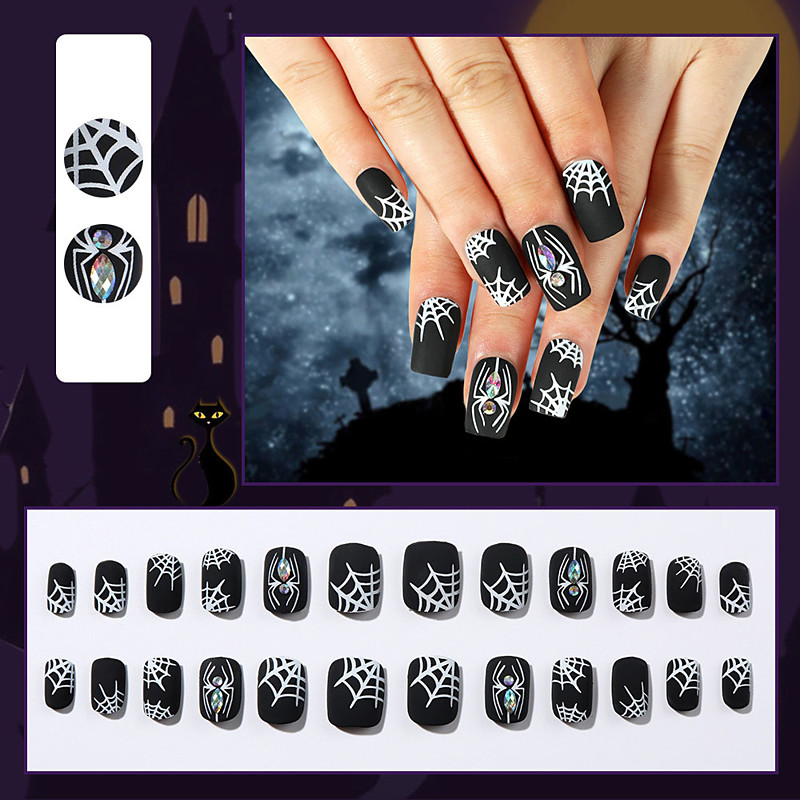 Halloween Long Stiletto Press-On Nails – 24pcs Spider Design Medium Length Fake Nails for Halloween Makeup Party