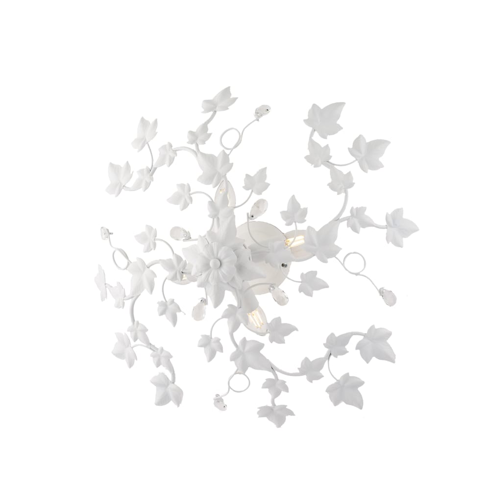Plafoniera shabby 4 luci ferro battuto bianco con foglie e cristalli