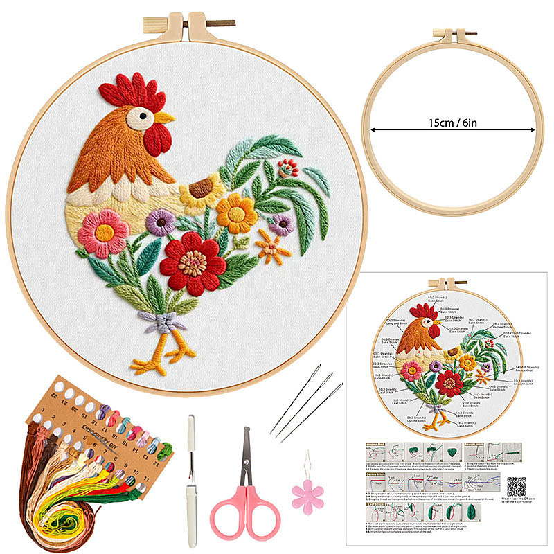 Rooster Embroidery Kit: Floral Needlepoint, Beginner DIY Project, Holiday Home Decor Gifts