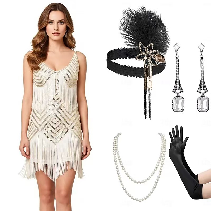 Set Roaring 20s 1920s Cocktail Dress Mini Flapper Dress Dress Outfits with Accessories Sleeveless The Great Gatsby Charleston Sequins Tassel Fringe Feather Deep V Fancy Dress Women's Carnival New