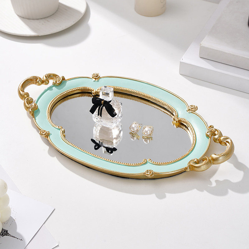 Rose Wreath Mirrored Decorative Tray, Hand-Painted Resin Vanity Organizer with Glass Mirror, Jewelry Makeup Display for Tabletop Decor, Valentine's Day Wedding Accent