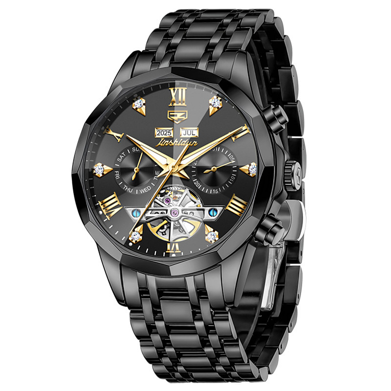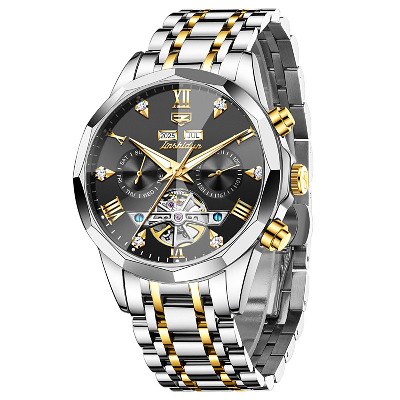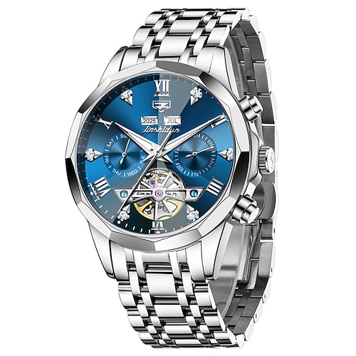 OLEVS Men Automatic Watch Leather Strap Calendar Skeleton Dial Trend Classics Male Waterproof Moonswatch Wristwatch 7009