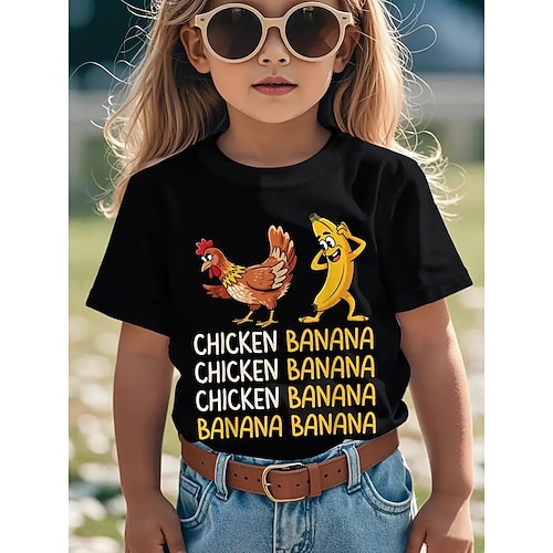 Cotone Bambini Ragazze Nero Pollo e banana Grafico Maglietta Girocollo Manica Corta Vacanza Sport Outdoor Abbigliamento Quotidiano Sport Moda Casual Stampa Estate