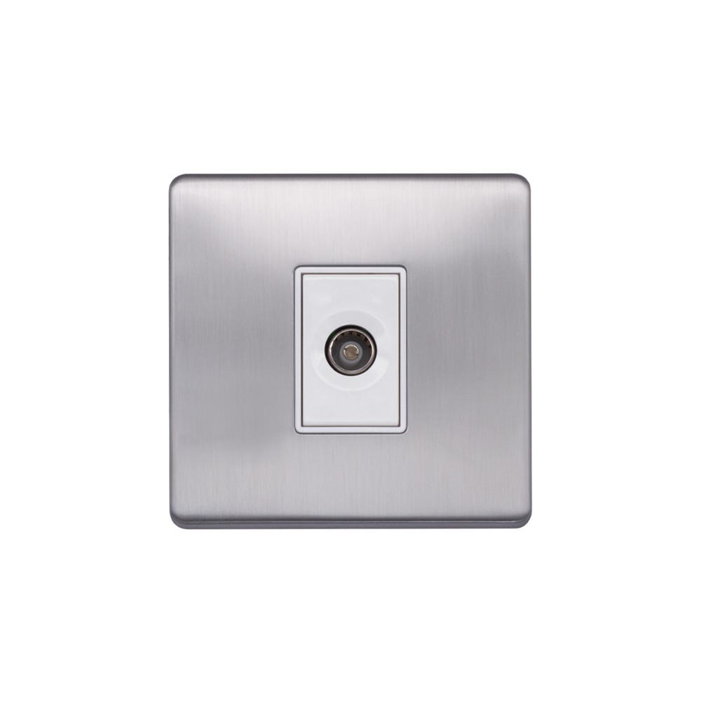 Lieber Brushed Chrome 1 Gang TV Aerial Socket - White Insert Screwless - Size: 86mm x 86mm x 2.4 mm