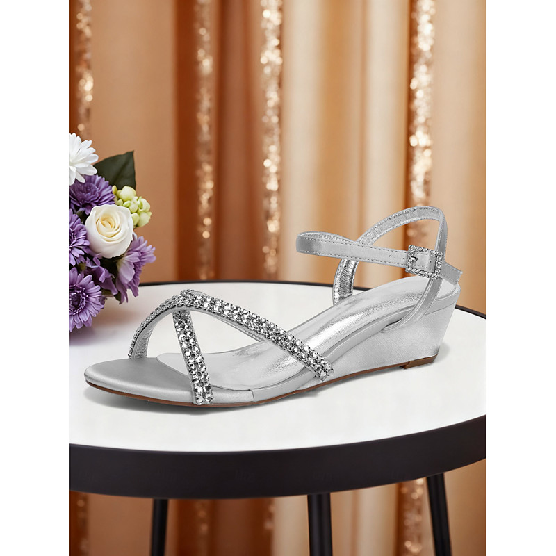 Women's Blue Rhinestone Wedge Sandals - Elegant Open Toe Ankle Strap Heels for Party and Evening Events