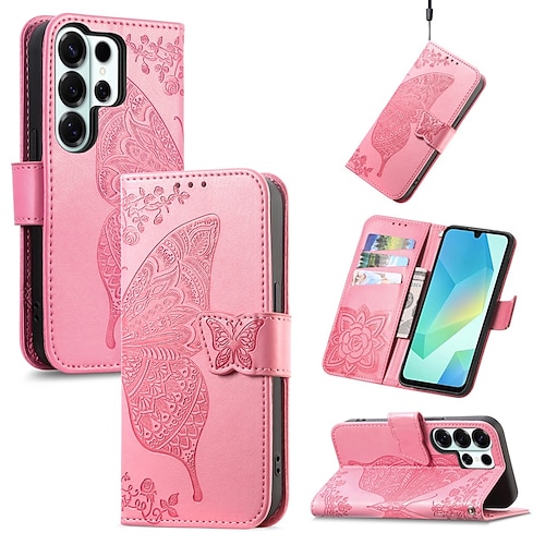 Handy Hülle Handyhüllen Für Samsung Galaxy S26 S26 Plus S26 Ultra Brieftaschenhülle Flip-Cover Mit Handgelenkschlaufe Ständer Schmetterling Retro TPU PU-Leder