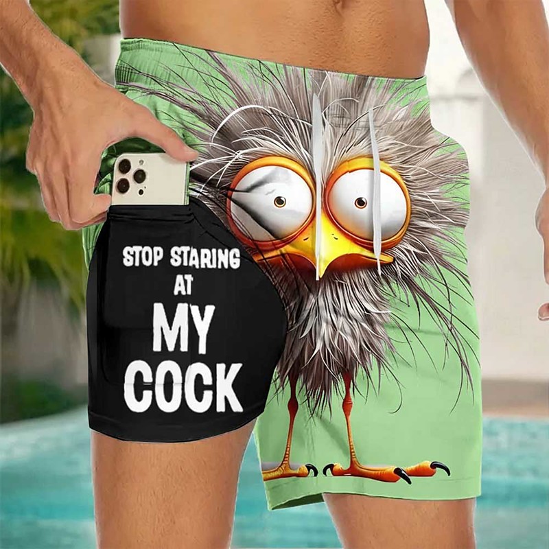 Men's Cartoon Rooster Funny Slang Lined Shorts 2 in 1 Board Shorts Swim Shorts Mid Waist Hawaiian Holiday Side Pockets With Compression Liner Elastic Drawstring Waist Designer Clothing Apparel