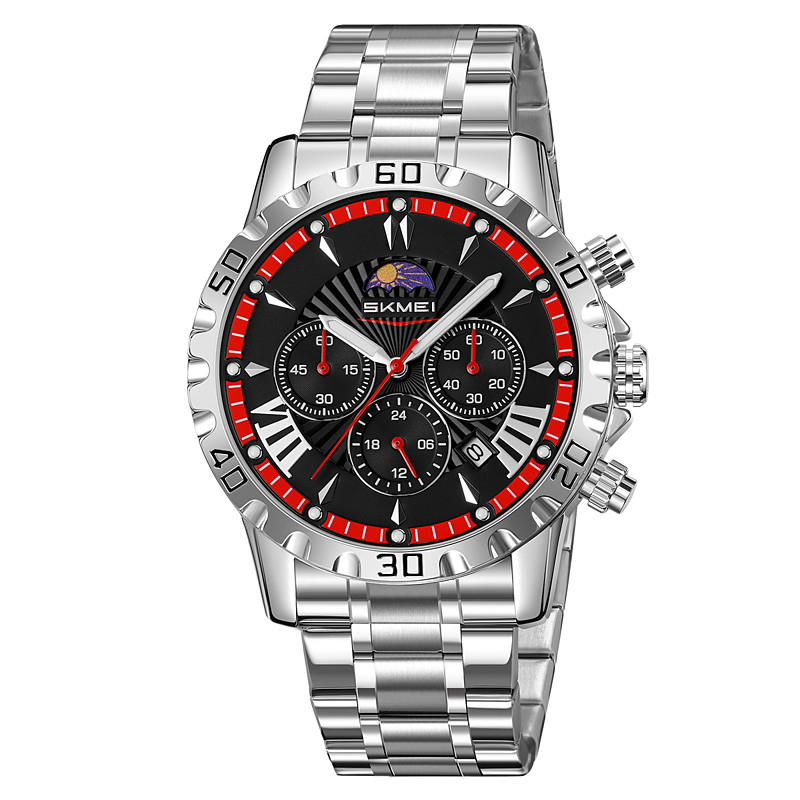 SKMEI Men's Sun Moon Star Steel Belt Watch Multi Functional Three Eye Six Needle Timing Night Light Pointer Watch