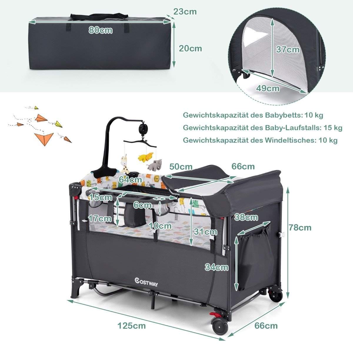 4 i 1 mobil babyseng med myggnett og madrass og 6 justerbare høyder grå