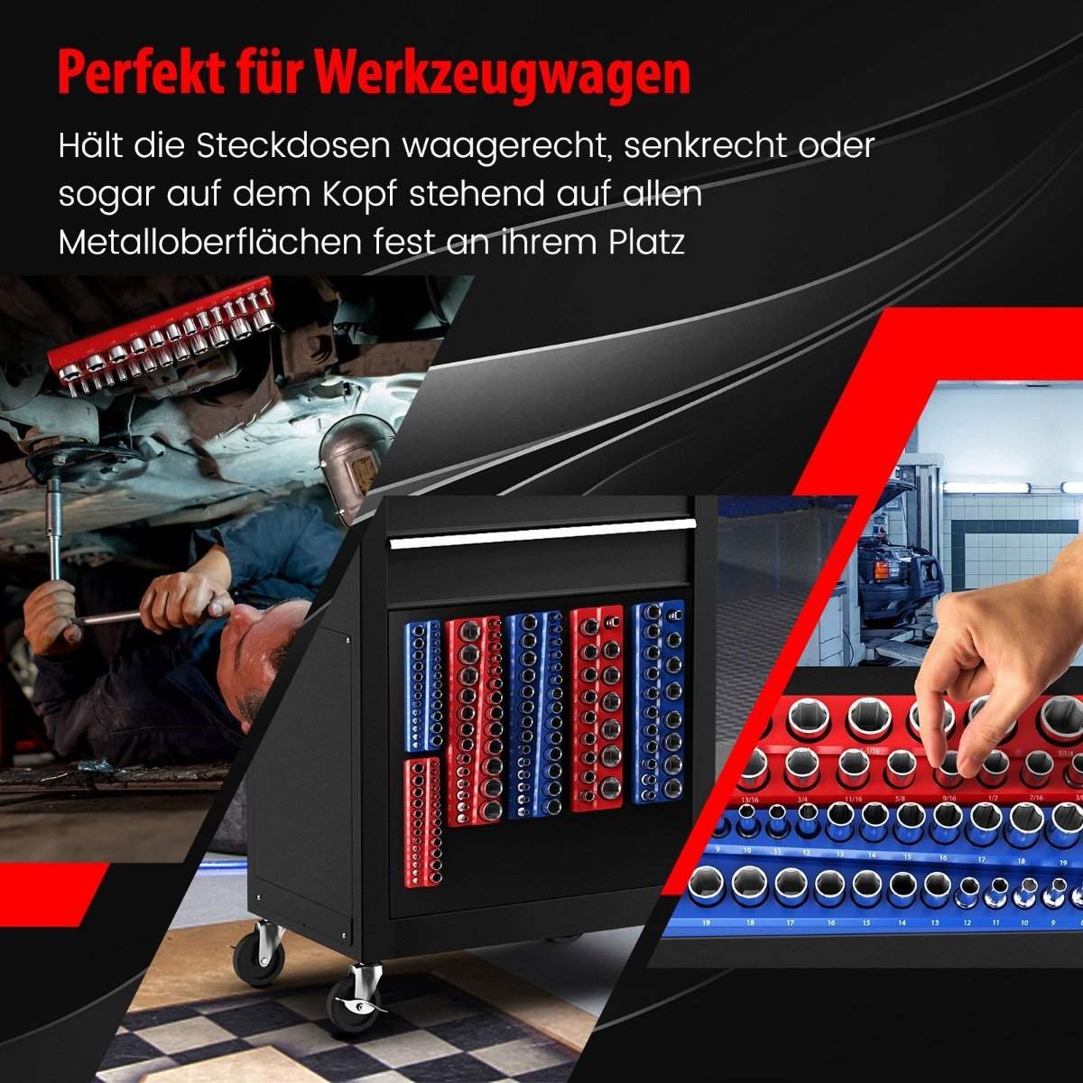 Pakke med 6 pipenøkkelholdere magnetiske 1/2-tommers, 3/8-tommers og 1/4-tommers festeskinne for stikkontakter