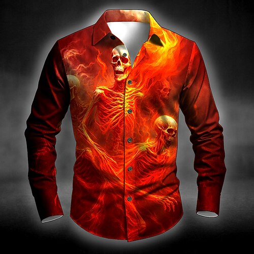 Herren Totenkopf Flamme Kostüme Hemd Knopf Hemd Langarm Dunkel Punk Gothic Stil Outdoor Feiertag Sommer Frühling Umschlag 3D Druck Kragenhemden Rot Blau Dunkelgrün