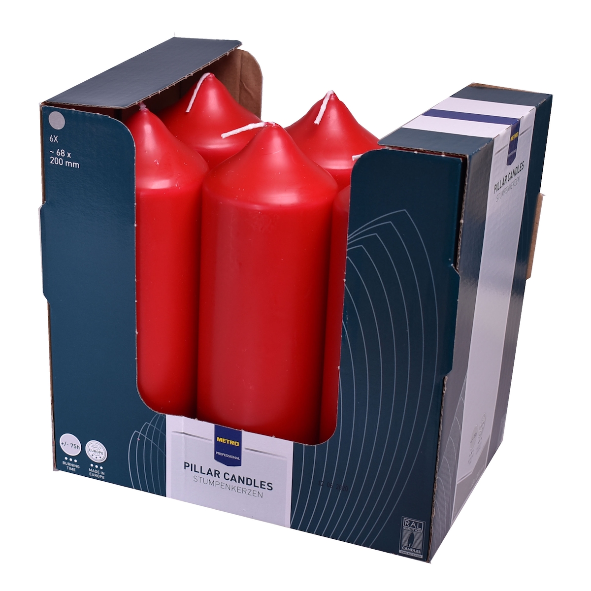 METRO Professional Stumpenkerzen, Paraffin, 6.8 x 20 cm, ca. 75 Std., rot, 6 Stk.