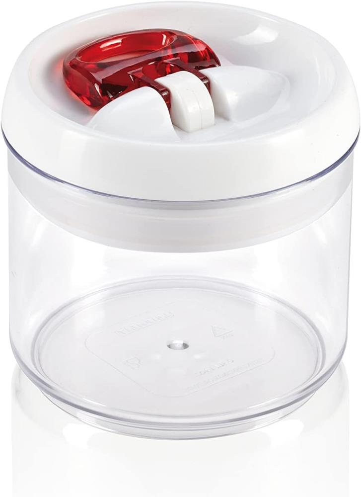 Leifheit Fresh and Easy Vorratsbehälter 400 ml, rund, luft- und wasserdichte Vorratsdose mit patentierter Einhand-Bedienung, Frischhaltedose, stapelbare Aufbewahrungsboxen, transparent, rot - OVP