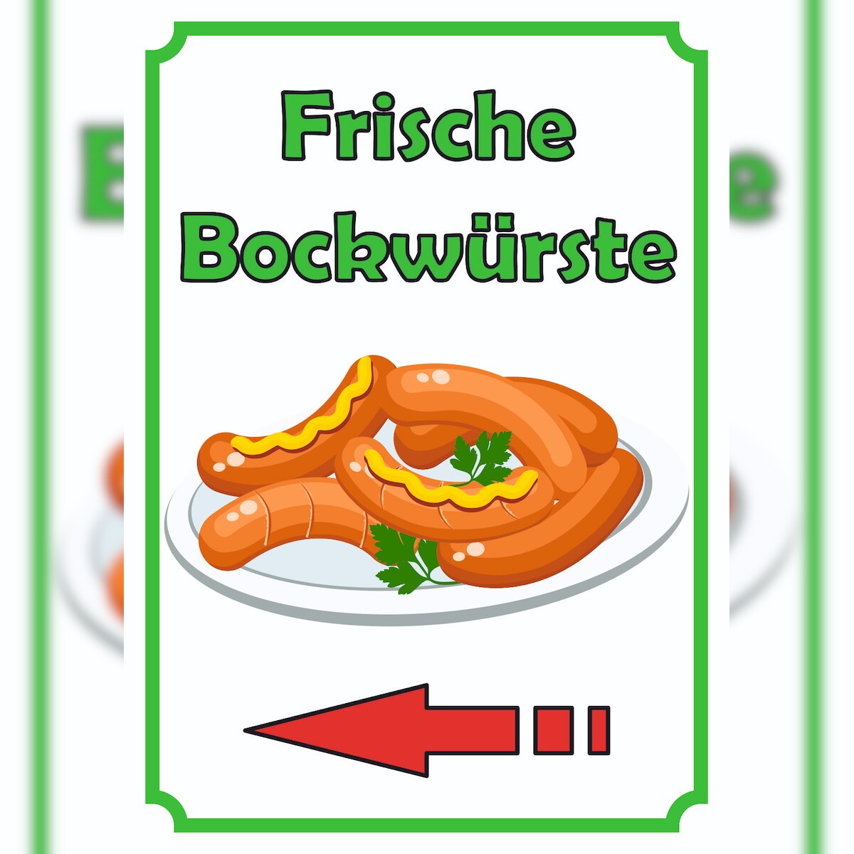 HB-Druck Frische Bockwürste Verkaufsschild Schild hochkant mit Pfeil nach links A5 (148x210mm)