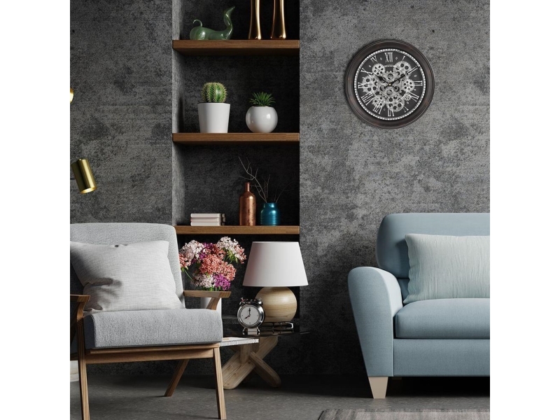 Vilde Wanduhr Anhänger Industrie rund schwarz silber bewegliches Räderwerk loft 35 cm