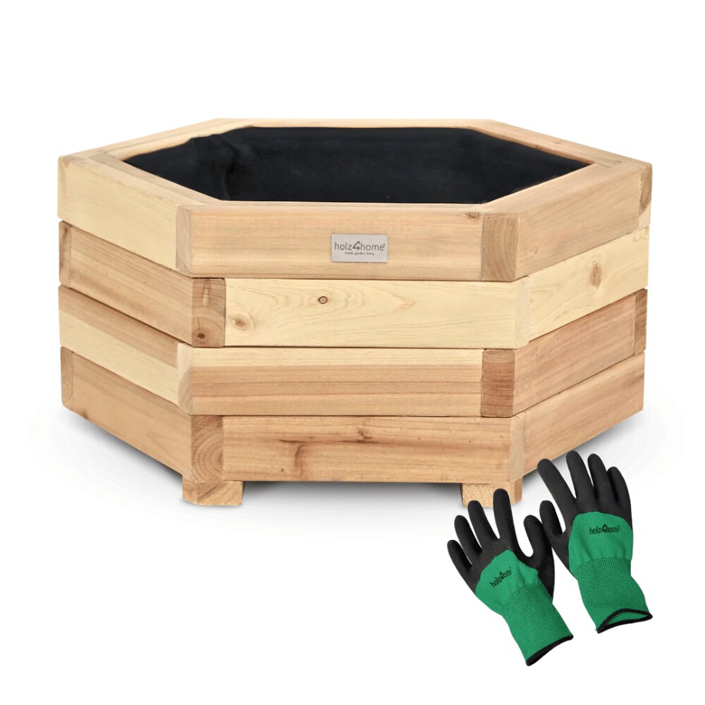 DELUKE Pflanzkasten Holz 6-eckig MICHA - Inkl. Vlies und Handschuhe | Pflanzkübel Tannenholz Blumenkasten Blumenkübel Blumentopf Terrasse, 60cm Breit