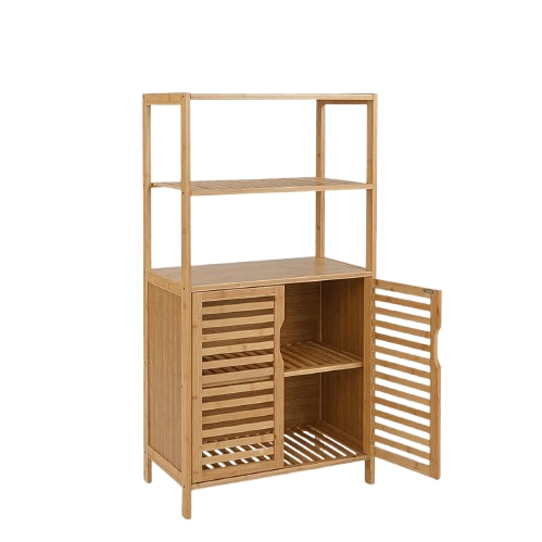 COSTWAY Bambus-Aufbewahrungsschrank, Badezimmerschrank mit 2 offenen Fächern, 2-türiger Lamellenschrank