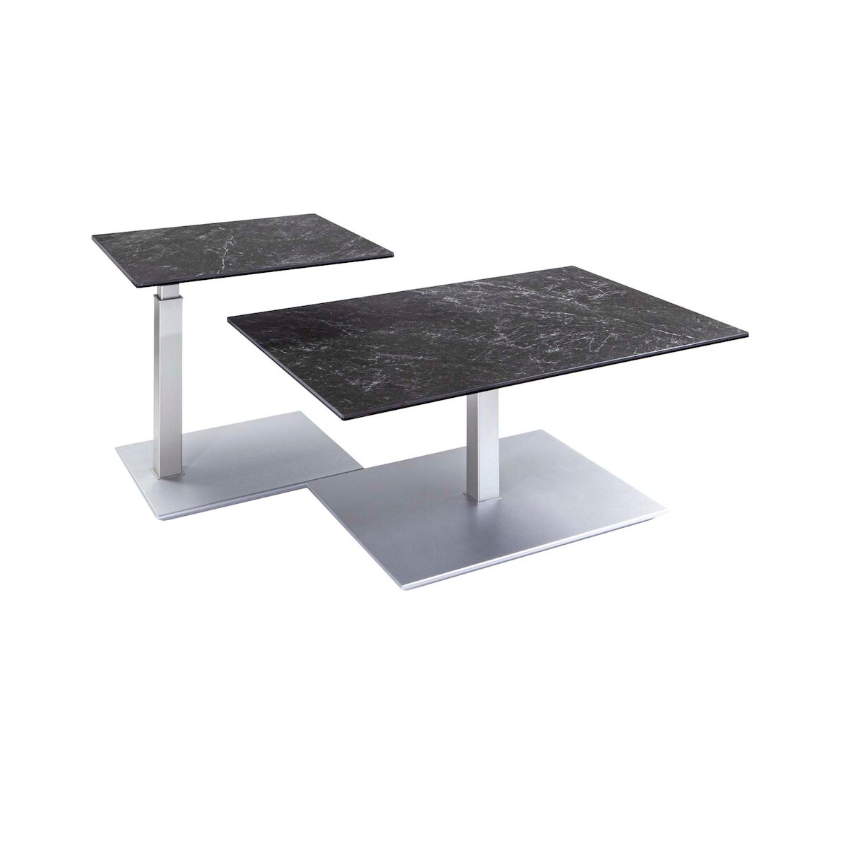 Vierhaus Couchtisch Platte Keramik Nero auf Glas, stufenlos höhenverstellbar, Metall perlsilberfarbig lackiert, rollbar